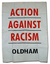 Thick plastic/tarpaulin-type material. The text is a robust adhesive plastic.