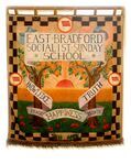 At the top third, partially obscuring the tops of the trees is a rectangular box of a light lilac colour with the name: "East Bradford Socialist Sunday School". This text is in an elegant uppercase font, coloured navy blue, apart from the first letters of each word and all of "school" which are coloured gold with a navy blue shadow. Between "East" and "Bradford" are small gold crosses with navy blue shadows and either side of "school" are slightly larger sun with the same colour arrangement.