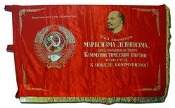 Much of the left side of the banner is occupied by a large, circular, hugely intricate and detailed illustration. At its base is a ribbon-like scroll with gold trim, from behind which a golden sun is rising, giving off many gold rays. Enveloping the sun from both sides the ribbon is tightly wrapped sheafs of corn, which arch up and round to create the oval shape. On each side seven flat faces of the ribbon are visible, all of which have Russian text in gold. Above the sun's rays, in the hollow of the circle, is a detailed globe with gold latitude and longitude lines, with gold and green land. In front of the globe is a large golden hammer and sickle. The ends of the ribbon can be seen to disappear behind the globe. Above the globe, joining the ends of the two arcs of corn, is a five-point star with gold trim.