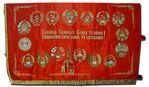 Around the edges of the reverse of the banner are 16 circular illustrations, like the one on the front but smaller. They are all variations of the large one, repeatedly including hammer and sickle, corn, globe, star, sun and rays. They are all gold but with different colours in the detail from illustration to illustration. All are unique, very intricate and include various amounts of Russian text.