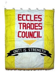 3-ply, thick cotton. Front and back plies made of 3 pieces stitched together vertically. All details are pieces of cotton material, embroidered onto the banner. There are tassels, also embroidered to the banner, which are a thin rope-like material.