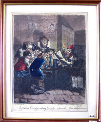 Six brutal-looking men, much caricatured, sit round a table in a cellar, listening with apprehensive intentness to their chairman, who reads a paper: "State Arrests—O'Conner Binns Evans Quigley". He sits in an arm-chair, a grotesque ragged creature with sleeves rolled up ; in his r. hand is a candle taken from a candle-stick on the table. Beside him is a tankard inscribed: "Tom Treason Hell-Fire Celler Chick Lane". Against his chair leans an open book: "Proceedings of the London Corresponding Society Ts Firebrand Secretary- Delegates- Forging Sam Barber Joe Dick Butcher Dissenting Nick Sheepshead Will Cut down Lary". These names belong to the persons depicted: a barber sits on an upturned tub on the chairman's l., a comb in his ragged hair, a pair of tongs leaning against the tattered hat which lies beside him. Next (l.) is a butcher, his steel hanging from his waist. All are grotesque denizens of the underworld. Two prints are on the brick wall, bust portraits of Horne Tooke and Tom Payne. Through an open door (r.) is seen a flight of stairs, steeply ascending.
