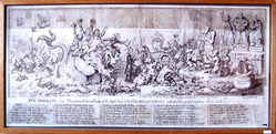The group is on a circular stone dais supporting the altar, on which stand three figures on bases inscribed respectively (l. to r.) Justice, Philanthropy, Sensibility: (1) A frenzied hag ('The avenging angel of regenerate France'), with the snaky locks of Discord, holds a dagger in each hand; her breasts hang to her belt, which is inscribed Egalite; she tramples on the sword and scales of Justice. (2) A stout woman clasps a globe on which Europe, Asia, and Africa are indicated, squeezing it out of shape. (She 'glows with the general love of all mankind'.) She tramples upon papers: "Ties of Nature” and "Amor Patriae". (3) A weeping woman looks down at a dead bird in her r. hand ; in her l. is a book Rosseau [sic]; she tramples on the decollated head of Louis XVI. She illustrates the lines (not quoted) on 'Sweet Sensibility' (mourning for 'the widow'd dove'). A pillar beside the altar is encircled with the names of "Voltaire", "Robertspierre", "Mireabeau". Against the altar step (r.) lies a bundle of three books, two being Common Prayer and Holy Bible, tied up with a tricolour scarf inscribed "pour les Commodites". Next it is a sack bulging with church plate, including a chalice and mitre ; this is "Philanthropic Requisition". Poets head the procession, carrying and escorting a large "Cornucopia of Ignorance" from which pour papers and pamphlets; Southey, with an ass's head and hoofs, kneels beside it in obeisance to Lepeaux, holding out Southeys Saphics; his Joan of Arc protrudes from his pocket. Coleridge, also with an ass's head, holds out Coleridge Dactylic[s]. Two little ragged men (with a third who is partly hidden) support the cornucopia, convolutions of which are inscribed Critical Review, Monthly Review, Analytical Review. Their bonnets-rouges have the dangling bells of a fool's cap. Two frogs squat beside the cornucopia holding up a large paper: Blank Verse by Todd & Frog [Blank Verse by Charles Lloyd and Charles Lamb, 1798]. They are the 'five other wandering bards': "C----dge and S—th—y, L--d and L--b and Co". With these (and next Coleridge) Lord Moira (not mentioned in 'The New Morality', but a butt of the Anti-Jacobin) stands stiffly in profile, offering his sword to Lepeaux, and holding out a paper: "Relief for Irish Philanthropists". Behind the cornucopia is a man supporting a basket on his head containing plants, on each of which sprouts a bonnet-rouge. It is labelled Zoonomia or Jacobin Plants (an appropriate offering to the botanist Lepeaux). He is Darwin (not caricatured in 'The New Morality'), whose "Loves of the Plants" had been parodied in the Anti-Jacobin. The last of the literary group are Priestley and Wakefield, each holding a pen and paper; the former, from whose pocket projects a paper, "Inflam[mable] Air", holds out "Priestley's Political Sermons". The other partly conceals his face with "Wakefield's answer to Llanda[ff]". In his Reply . . . (1798) to Watson's Address . . . he welcomed the prospect of a French invasion. The papers pouring from the cornucopia are Envy / Lies / Wilful Perversi[on] / Abuse / Ignorance. It has disgorged a pile of pamphlets which lie in the foreground at the altar step. Behind Priestley advances Leviathan, with the head of the Duke of Bedford, a barbed hook through his nose: "Thou in whose nose by Burke's gigantic hand \ The hook was fix'd to drag thee to the land", an allusion to the "Letter to a Noble Lord". The monster has a gigantic ear, a scaly body whose convolutions support a paunch and thighs terminating in a forked tail; it is on the edge of waves in which its followers are swimming. On its neck sits Thelwall, spattered with dirt, holding out "Thelwalls Lectures". Across its broad back straddle Fox, Tierney, and Nicholls, all wearing their bonnets-rouges; from the pockets of the two last issue respectively Tierney's Address and Nicols Speec[hes]. In the water swims Erskine, pen in hand, holding "Causes of the War 132nd Edit" [his Causes and Consequences of the War with France, 1798, rapidly went through forty-five editions]. Behind him floats a barrel, "Whitbreads intire"; it contributes to 'the yeasty main'. Immediately behind it is Norfolk, holding up a frothing glass, with a paper in his r. hand: "Whig Toasts & Sentiments". Near him the much smaller head and shoulders of Sir George Shuckburgh emerge from the water. Behind Norfolk is Burdett, cap in hand, holding up a paper: "Glorious Acquittal O' Conner dedicated to Lady Ox—d" (an early allusion to the liaison between them). Erskine, Norfolk, and Bedford have tails like that of Leviathan; the other swimmers may be presumed to have them. Behind them is Lord Derby, waving his cap and revealing small horns on his head. Next is Byng, holding up "Coco’s Address to the Electors] of Middlesex". He is followed by Courtenay, holding up a pamphlet: "Stolen Jests upon Religion"; the point of his cap has a bell indicating Folly. All these are 'wallowing in the Yeasty main' which froths around them. Watching the procession is a crowd of humbler Jacobins, who wave caps and arms and shout in frenzied homage to Lepeaux. Among them is the inevitable chimney-sweeper waving brush and shovel. Above them (l.) fly five birds with human heads, the largest being Lansdowne with his inscrutable smile; his wings are feathered, those of the four smaller creatures are webbed. The foremost is (?) Stanhope, next a tiny Horne Tooke, then M. A. Taylor, and last, Lauderdale. In the foreground, in front of Leviathan, and on dry land, is a procession of small monstrosities. First, a crocodile wearing a pair of stays, to indicate Tom Paine; his jaws are wide, and he weeps; under his forelegs is a paper: "Paines Defence of the 18 Fructidor". Next stands a little creature, wearing only leg-irons and spectacles, and writing: "Letter from an Acquitted Felon". He is Holcroft, writing probably his Letter to the Right Hon. W. Windham on the intemperance and dangerous tendency of his public conduct, 1795