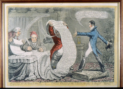 "This apparent anticipation of Burdett's motion on 12 Apr 1802 for an inquiry into the conduct of the late Administration suggests that Gillray may have had private sources of information. Burdett's extravagant speech was an attack on the war as 'the old struggle [by the French] for rights and liberties against arbitrary power ... the struggle in which the first Christians were engaged' Pitt's motives for making war were said to be the destruction of the liberties of England. The motion was lost by 246 to 39. ... 'Unaccounted Millions' is an allusion to the City petition of 5 July 1769 which styled Holland (Fox's father) 'the Public Defaulter of Unaccounted Millions', a phrase long remembered against Fox, who had inherited and squandered much of the official profits of Holland as Paymaster
