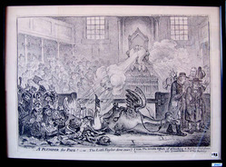 From Catalogue of political and personal satires preserved in the Department of Prints and Drawings in the British Museum: vol VIII - 1801-1810: "A scene in the House of Commons. In the foreground is the space outside the bar, filled with burlesqued supporters of Paull's petition against Sheridan's return for Westminster. These are struck by darts of fire, lightning and smoke from the speaker (Abbot), a diminutive figure, almost entirely composed of a huge wig. There are two main blasts, the larger (l) directed against Paull, the other (r.) against Bosville, Horne Tooke and Cobbett. In the former is the fiery face of Sheridan, glaring at his enemy, with flames from mouth to nostril. Paull has been thrown violently onto his back, having slipped from the back of a goose with the head of Burdett, on which he has ridden into the House. The goose waddles off to the right with outstretched neck, following Tooke, the toe of one of Paull's boots still in a stirrup. From Burdett's profile projects the beak of a goose; his long neck is labelled Green-Goose from Brentford. Burdett and his friends seem anxious to slink off without association with the calamity that has befallen Paull. The latter has dropped a long document which is blazing; ... A bonnet rouge falls from his head; he has dropped his yard-stick, shears, a cabbage, cucumbers. Behind him is his Counsel, Henry Clifford, in wig and gown, with a drink-blotched face, dropping a sheaf of papers: Brief - Paul versus Sheridan. He heads a crowd of disreputable witnesses, characteristic of Gillray's denizens of the underworld; some wear favours in their hats inscribed Paul. All fall backwards under the impact of the Speaker's blast. One man, the palm of his hand branded R T (signifying that he has returned from transportation), grasps a paper inscribed Perjury; a noseless old woman holds a Forged Letter of Richd Br Sherridan. One man holds up a marrow-bone, another a cleaver inscribed No Bastille, to show that they belong to Burdett's election mob ...