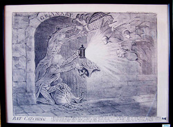 From Catalogue of political and personal satires preserved in the Department of Prints and Drawings in the British Museum: vol VIII - 1801-1810: "Addington and Hawkesbury, in the gateway of the Treasury (inscribed Granary), snare three bats with the heads of Grey, Sheridan and Tierney. Addington kneels on one knee holding out a dark lantern and a hat with a tricolour cockade filled with papers inscribed Sinecure, Place, Annuity, Pension, Post. Hawkesbury, standing behind him, holds out a net supported on two sticks in which to catch the creatures which fly, like harpies, straight towards Addington, dazzled by the lantern's rays. Grey's eyes are fixed on the lantern, those of Tierney and Sheridan, the last with an expression of eager greed, on the papers in the hat. Beside Addington there is a sack of Sterling British Corn, overflowing with guineas."