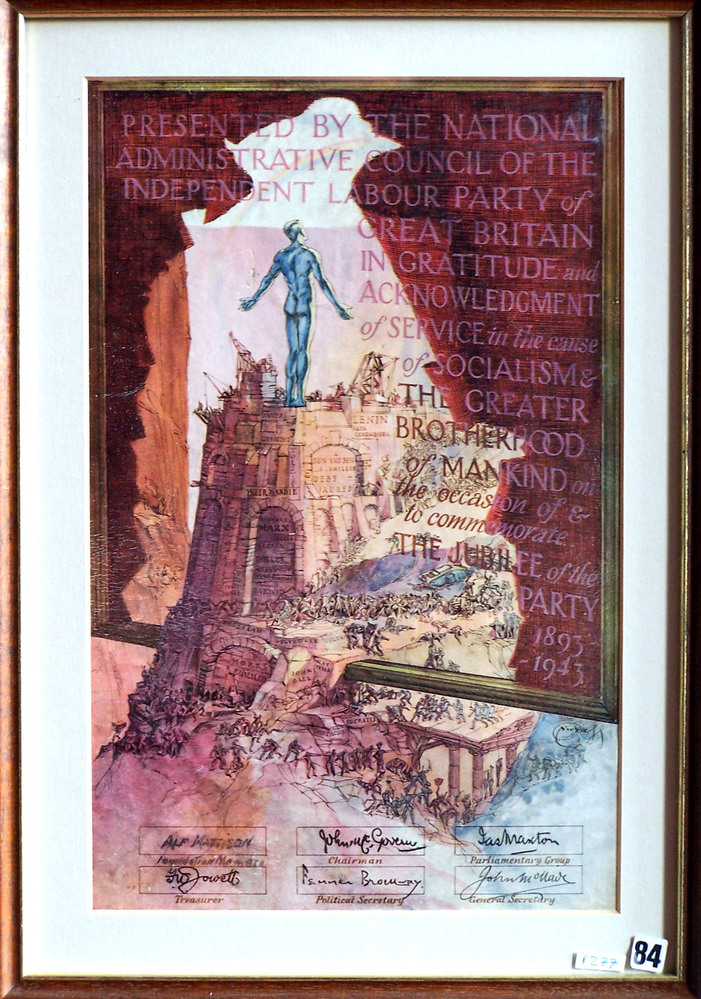Scope and ContentColour print of a poster celebrating the jubilee of the Independent Labour Party 1893-1943, with the text: Presented by the National Administrative Council of the Independent Labour Party of Great Britain in gratitude and acknowledgement of service in the cause of socialism and the greater brotherhood of mankind on the occasion of and to commemorate the jubilee of the party 1893-1943