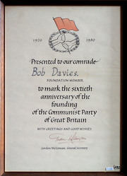 Scope and ContentCertificate presented to Bob Davies, with the text: Presented to our comrade Bob Davies, foundation member, to mark the sixtieth anniversary of the founding of the Communist Party of Great Britain. With greetings and good wishes, Gordon McLennan, General Secretary