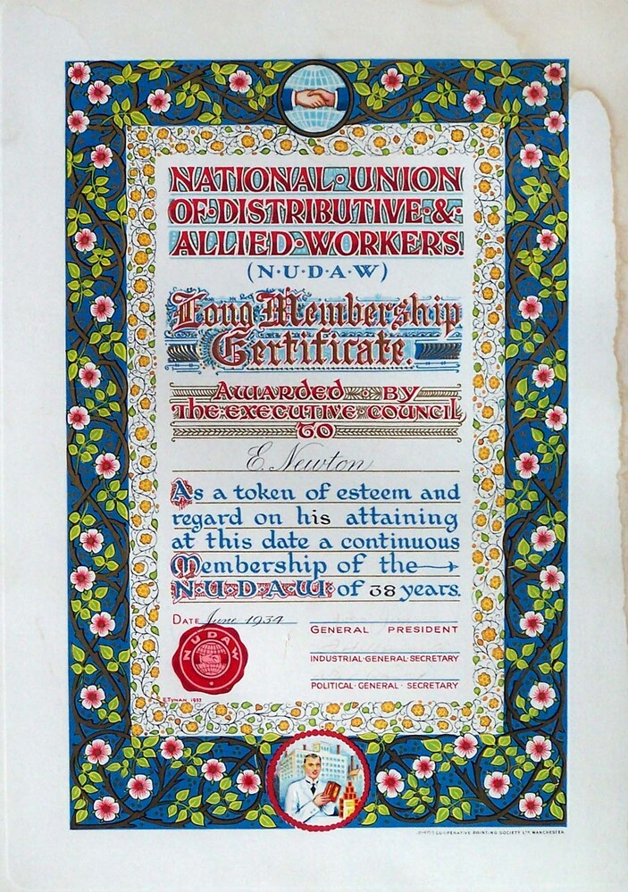 National Union of Distributive and Allied Workers long membership certificate, 934