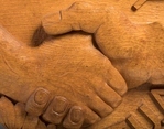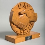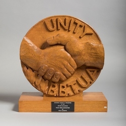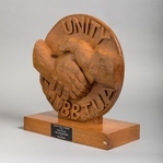 Scope and ContentRound wooden plaque with two clasped hands and the text: Unity. BBTUA. mounted on a wooden block. Attached plaque reads: Designed, carved and presented to the British Bulgarian Trade Union Association by Fred Clements