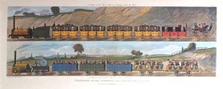 Scope and ContentColour print with the title Travelling on the Liverpool and Manchester Railway by I Shaw, showing carriages of first and second class passengers