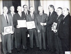 Scope and ContentBlack and white photograph of a group of nine men, four of which are holding framed Amalgamated Engineering Union Awards of Merit