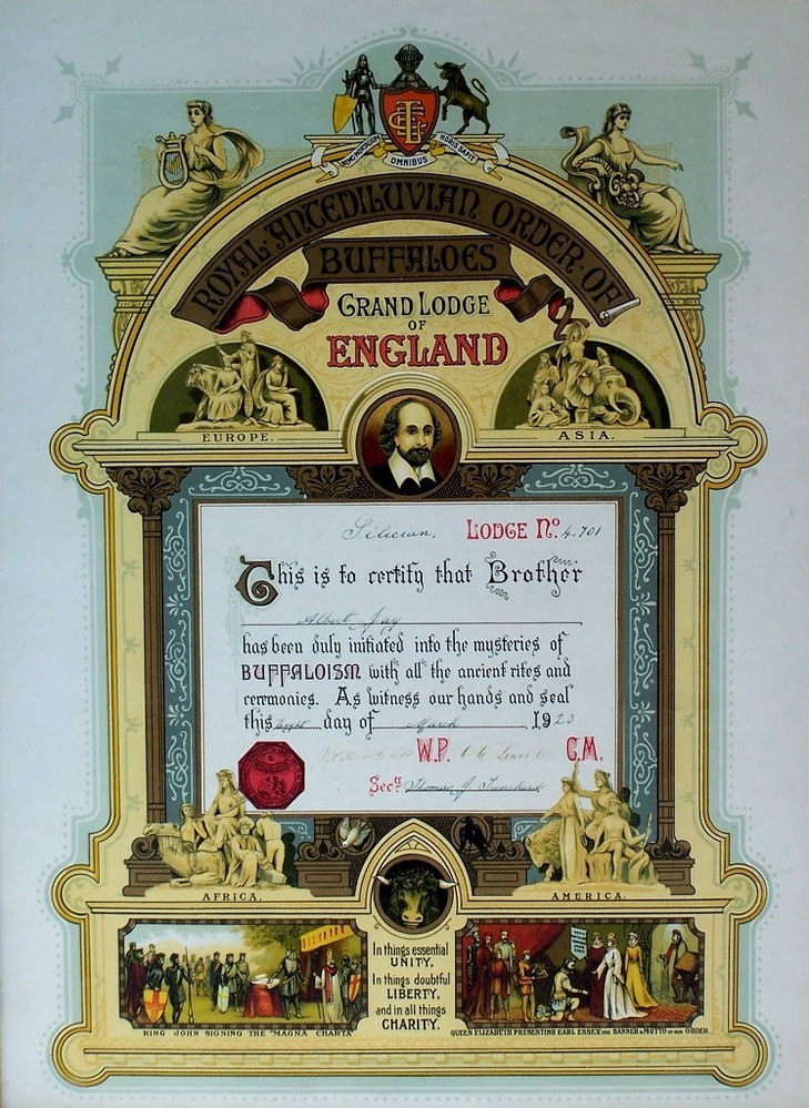 Royal Antediluvian Order of Buffaloes membership certificate, 1923