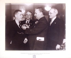 Scope and ContentBlack and white photograph of Ernest Bevin, the Dockers KC, presenting Mr W Barsby with the TUC medal for enlisting 321 members of the Hatters' Union