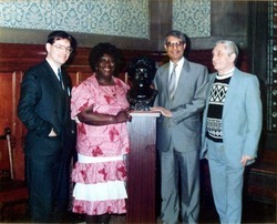 Scope and ContentColour photograph of a Sol Garson sculpture of Yomi Mambu (the first black person to hold the title of Lord Mayor in England, 1989-1990) on a plinth surrounded by 4 people, including Sol Garson and Yomi Mambu