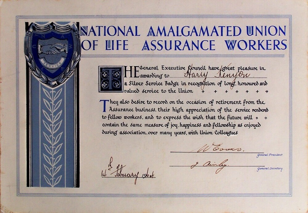 Scope and ContentSilver Service award of the National Amalgamated Union of Life Assurance Workers (NAULAW) awarded to Harry Kenyon on 14 Feb 1964.