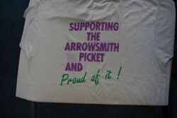 Scope and ContentWhite with purple and green lettering "Supporting the Arrowsmith Picket and proud of it!" on rear and "Arrowsmith GPMU picket line 1993" on front. Dispute in Bishop's Stortford or Bournemouth in the aftermath of the Wapping dispute.