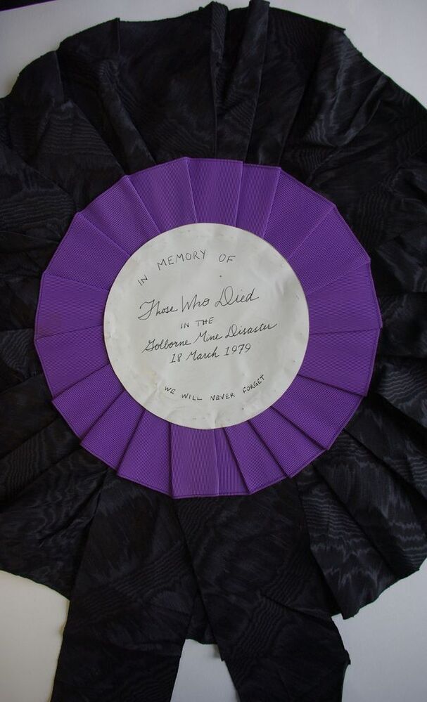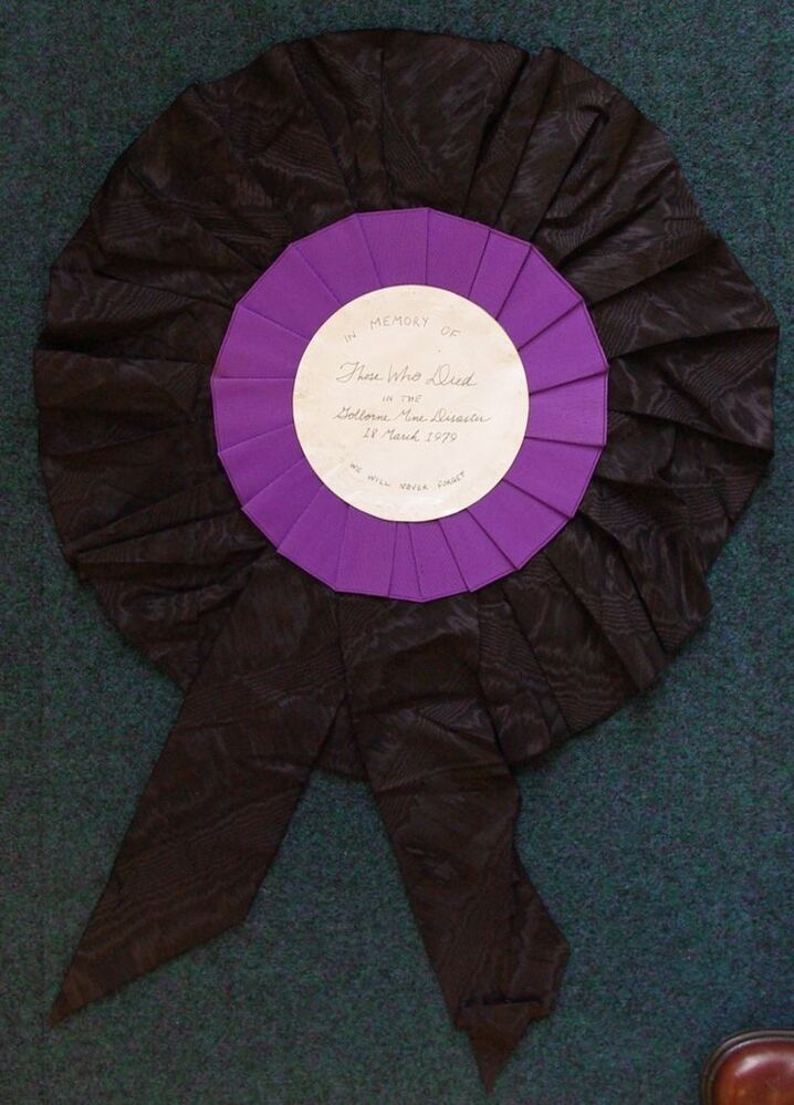 Scope and ContentRosette - black, purple and white. "In memory of those who died in the Golborne Mine Disaster 18 March 1979. We will never forget"