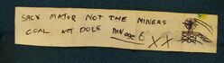 Scope and ContentPlastic banner."Sack Major not the Miners, Coal not dole, Dan age 6 XX" showing pit head gear.