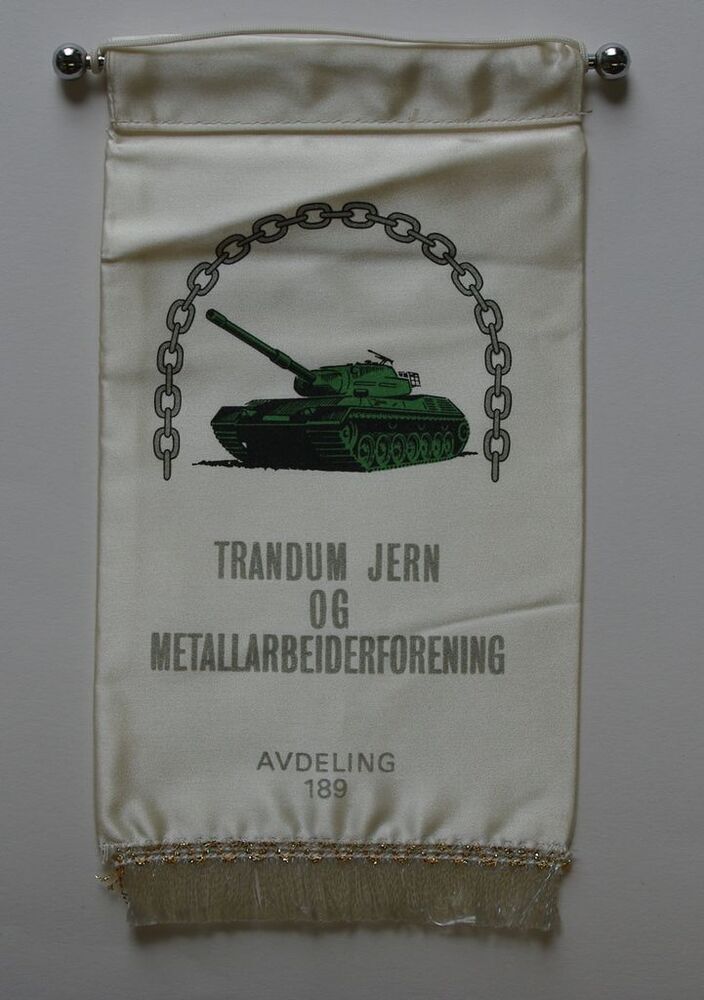 Scope and ContentWhite satin with picture of green tank and chain with lettering "Trandum jern og metallabeiderforening. Avdeling 189"