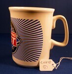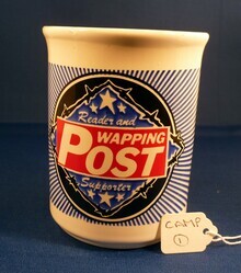 Physical descriptionDimensions (Height x Base x Rim): 98mm X 72mm X 78mm; Shape: Cylindrical, slightly fluted rim; Colour: White, blue, black and red illustration; Manufacturer: English Ironstone Tableware