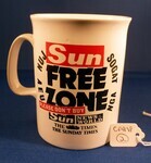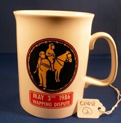 Scope and ContentWapping Dispute mug. Front - Illustration of 2 riot police, one on horseback. Text - 'May 3rd 1986 Wapping Dispute'. Back - text - 'Sun Free Zone. Please don't buy the Sun, News of the World, The Times, The Sunday Times. NUJ, AEU, SOGAT, NGA.'
