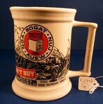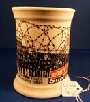 Physical descriptionDimensions (Height x Base x Rim) 101mm x 85mm x 82mm; Shape: Cylindrical, fluted rim, flanged base, rope handle, tankard style; Colour: Cream, black illustration and black and red text; Manufacturer: KL Commemorative Pottery