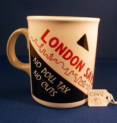 Scope and ContentLondon says axe the Tax mug. Wrap around illustration showing building and road with triangles. Text - 'London says axe the Tax. No Poll Tax. No cuts. With the Anti-Poll-Tax Unions'.