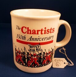 Scope and ContentThe Chartists, 150th anniversary mug. Front and Back- Illustration of Chartists marching with banner; 'Votes for All'. Text - 'The Chartists 150th Anniversary'.