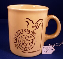 Scope and ContentChartism, 1839-1989 mug. Back text - 'The six points of the people's charter'. Front - illustration of Lion and Dove. Text - '1839 Chartism 1989. Peace from Strength'.