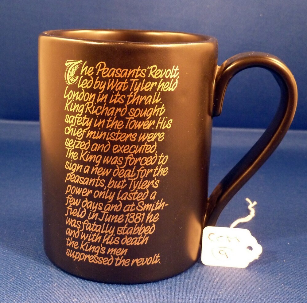 Scope and ContentThe Peasants Revolt, 1381 mug. Front- Text - 'The Peasants Revolt led by Wat Tyler...'. Back - illustration of the suppression of the revolt, June 1381. Base - Text - 'Designed by Jack Stoddart for the National Union of Agricultural and Allied Workers'.