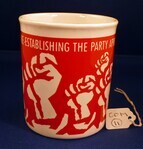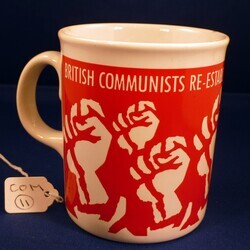 Scope and ContentBritish Communists Party mug. Red wrap around banner, white clenched fists. Text - 'British Communists Re-establishing the Party April 1988'.