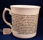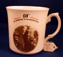 Scope and Content40th Anniversary of the Welfare State mug. Front - Illustration of Attlee celebrating election victory. Text - 'In celebration of the 40th Anniversary of the foundation of the Welfare State'. Back text - 'The 1945 election proved the most dramatic in British political history. Labour, who in the last election in 1935 had only 157 MPs, received nearly 12 million votes. And with 393 MPs Labour had, for the first time, a clear majority over all other parties. The mood in the House was exciting: two-thirds of the Party had never been in Parliament before and many were youngish, middle-class professional people. This made the PLP more fully representative than ever before of all classes, occupations and ages in British society. The stage was set for a radical Labour Government to guide the nation towards Socialism.'