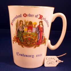 Scope and ContentIndependent Order of Rechabites mug. Front - Motif depicting 2 women in garden. Text - 'Independent Order of Rechabites Centenary 1935'. Back text - 'Northumberland District Souvenir'.