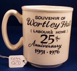 Scope and ContentWortley Hall, 25th Anniversary mug. Front - illustration of Wortley Hall. Back - Text - 'Souvenir of Wortley Hall (Labour's Home), 25th Anniversary, 1951-1976'