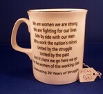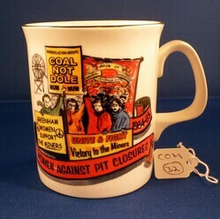 Scope and ContentWomen Against Pit Closures mug. Front - Picture of campaigning women with banners. Text - 'Women Against Pit Closures'. Back text - 'We are women we are strong / We are fighting for our lives / Side by side with our men / Who work the nations mines / United by the struggle / United by the past / And it's here we go here we go / For the women of the the working class. Celebrating 20 years of struggle'. Design by Ashley Jackson