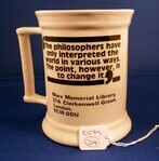 Scope and ContentKarl Marx, 1818-1883 mug. Front - Picture of Karl Marx, text below - 'Karl Marx 1818-1883'. Back - text 'The philosophers have only interpreted the world in various ways. The point, however, is to change it. Marx Memorial Library'.