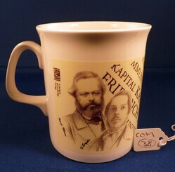 Scope and ContentKarl Marx mug. Wrap around illustration pictures of Karl Marx and Fredrich Engels. Text - Communist manifesto Karl Marx, Frederich Engels, Marx Memorial Library