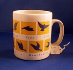 Scope and ContentManchester Nuclear Free City mug. Wrap around illustration of yellow squares with blue birds. Text - 'Manchester Nuclear Free City'.