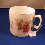 Physical descriptionDimensions (Height x Base x Rim): 83mm x 79mm x 84mm; Shape: Cylindrical, Tapered; Colour: Handle - White and gold; Body - White and pink, brown, green, gold, yellow and blue; Materials: Clay, glaze. paint; Method: Stencil; Manufacturer: Co-operative Wholesale Society