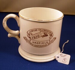 Scope and ContentHadfield Equitable Co-operative Society Limited, 50th Jubilee Celebration 1910 mug. Front: illustration of premises. Back: Ribbon text - Jubilee celebration 1910. Hadfield Equitable Co-operative Society Ltd.