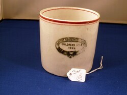 Physical descriptionDimensions (Height x Base x Rim): 87mm x 91mm x 91mm; Shape: Cylindrical; Colour: White, black with red rim and stripe on handle; Material: Clay, glaze, paint; Method: stencil