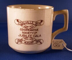 Scope and ContentCoalville Working Men's Co-operative Society Ltd, Jubilee Gala mug. Front: Text - 'Co-operative Society Ltd Jubilee Gala'. Ribbon text - 'Coalville WM 1882 August 1932'