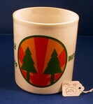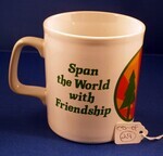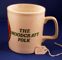 Scope and ContentWoodcraft Folk mug. Front: Text - 'The Woodcraft Folk'. Back: Text - 'Span the World With Friendship'. Side: Circular Woodcraft emblem with red and orange rays radiating out.