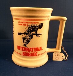 Scope and ContentInternational Brigade mug. Front: Illustration of armed soldier with text - 'Volunteers for Liberty Spain 1936/9 International Brigade'. Back: Illustration of the memorial to the International Brigades unveiled 5th Oct 1985. Text - Memorial to the International Brigade, South Bank, London, unveiled on 5th Cot 1985. 50th anniversary commemoration. Side text - From 1936-39 democratic Spain was attacked by fascist forces aided by Nazi Germany and fascist Italy. From all over the world men and women cam to help defend Spanish democracy. Over 2100 volunteers went from Britain, of these 526 were killed and many wounded and maimed. Their heroism and sacrifice inspired the world