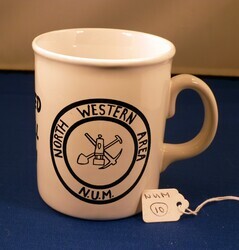 Scope and ContentNational Union of Mineworkers, North West area mug. Front: Badge depicting miners lamp, pick and shovel. Outer text - 'North West Area NUM'. Side text - 'United We'll Win'. Back: Illustration of Yorks Area NUM Badge.