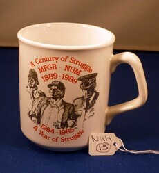 Scope and ContentNational Union of Mineworkers, A Century of Struggle mug. Front: Image of Arthur Scargill being led off by police. Text above - 'A Century of Struggle MFGB - NUM 1889-1989'. Text below - '1984-1985 A Year of Struggle'.