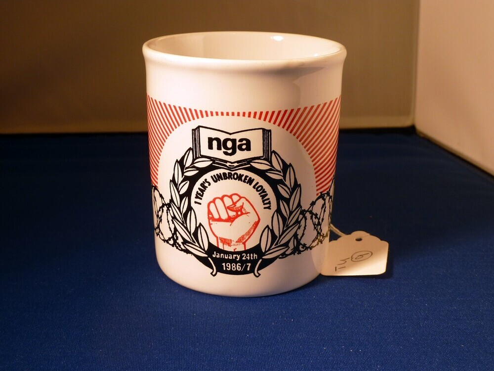 Scope and ContentNational Graphical Association, 1 years unbroken loyalty mug. Text - 'NGA. 1 Years unbroken loyalty. January 24th 1986/7'. Illustration - Black barbed wire. In the centre is a circular wreath with red clenched fist with a NGA badge above. Red lines radiate out from above.