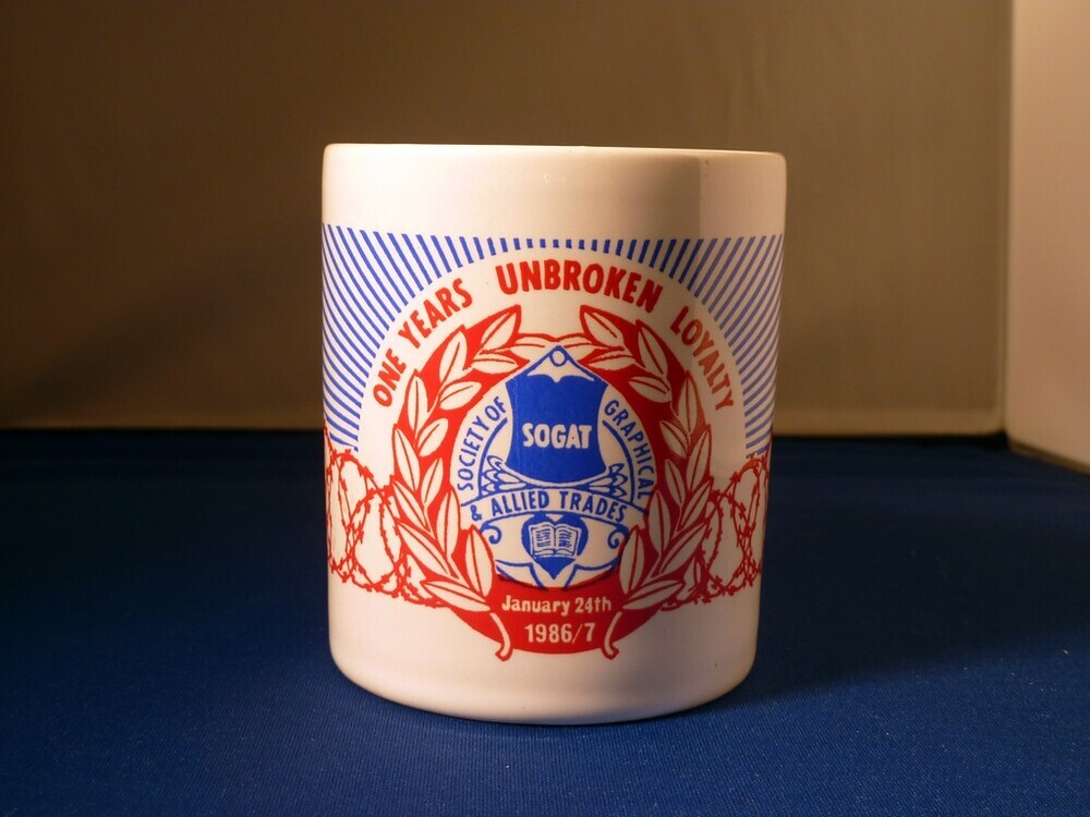 Society of Graphical and Allied Trades 1982 (SOGAT '82): one years unbroken loyalty mug, 1987