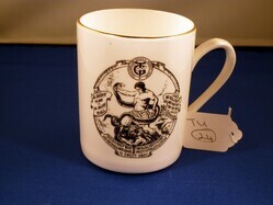 Physical descriptionDimensions (Height x Base x Rim): 95mm x 73mm x 77mm; Shape: Cylindrical; Colour: White with black badge, illustration and lettering. Gold rim, gold line on handle; Materials: Bone china